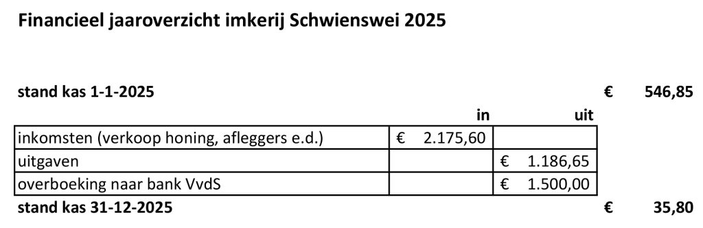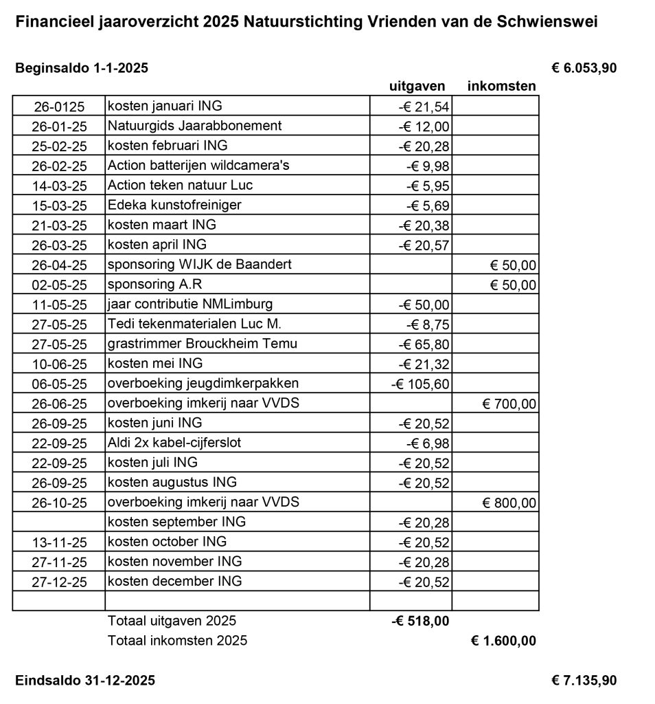 Bijgaand het financieel jaaroverzicht van de Natuurstichting Vrienden van de Schwienswei en van de imkerij Schwienswei